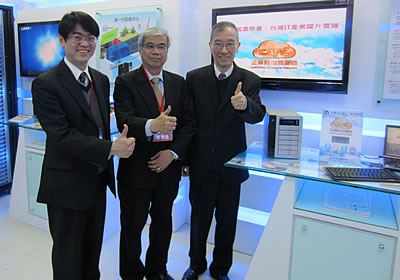 | 喬鼎資訊與由經濟部技術處指導的資策會在新啟用的雲谷中心共同聯展SmartStor Cloud私有雲儲存解決方案,獲得極高評價(左起: 資策會雲端系統軟體研究所李漢超副所長、喬鼎資訊李志恩董事長、資策會王瑋副執行長)。 |
